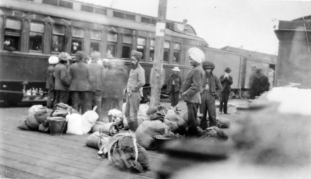 Grupo de inmigrantes sikh en la estación ferroviaria de Vancouver.