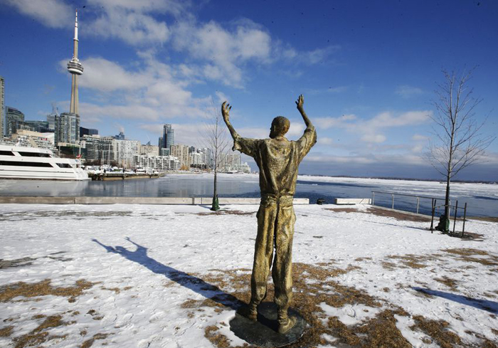 El personaje que vemos (¿saludando?, ¿pidiendo ayuda?, ¿celebrando?) es una de las 5 esculturas de bronce de Rowan Gillespie realizadas para el Toronto Ireland Park. El grupo representa la llegada de inmigrantes irlandeses a Toronto en 1847 cuando huían de la Grand Famine y conforma una unidad conceptual con un grupo escultórico similar ubicado en el puerto de Dublín.