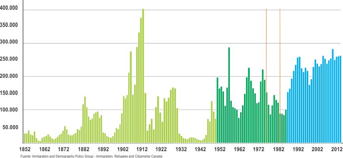 Representa la cantidad de inmigrantes ingresados a Canadá entre 1852 y 2012, expresada en cientos de miles.